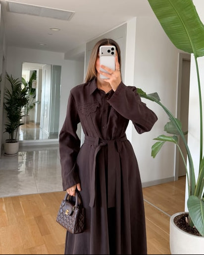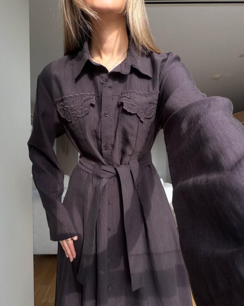 Andel Embroidered Detail Pocketed Midi Dress - Brown