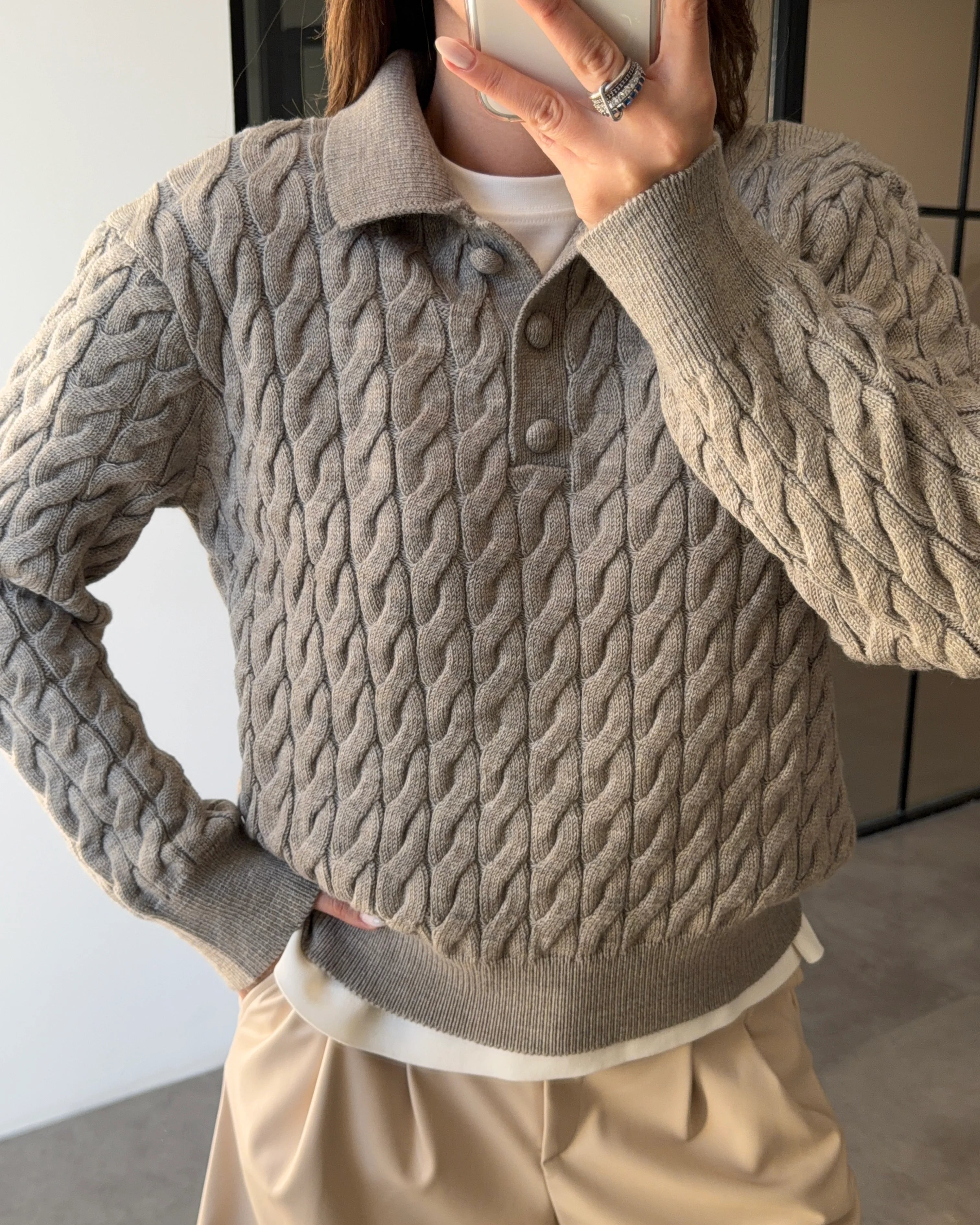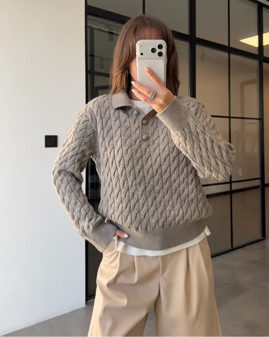 This chic dark beige sweater features a classic polo collar and intricate cable knit detailing for a cozy yet sophisticated look. Crafted from a soft acrylic blend, it offers the perfect balance of warmth and durability for your autumn wardrobe. The standard fit effortlessly flatters various body types, making it a versatile staple for casual or semi-formal outings. Wrap yourself in style with this elegant knitwear piece that brings a touch of texture to every ensemble.