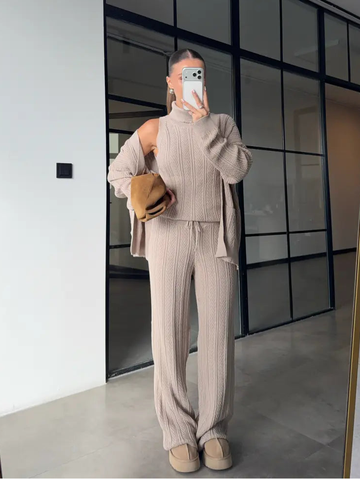 Snuggle up in style with this delightful 3-piece knit set, perfect for looking effortlessly chic. It features a cozy turtleneck, a stylish cardigan, and comfortable high-waisted pants for a complete, harmonious look. Crafted from a soft cotton-polyester blend, this ensemble promises both warmth and breathability. Whether you're lounging or stepping out, this stone-colored set ensures you're wrapped in comfort and modern elegance.