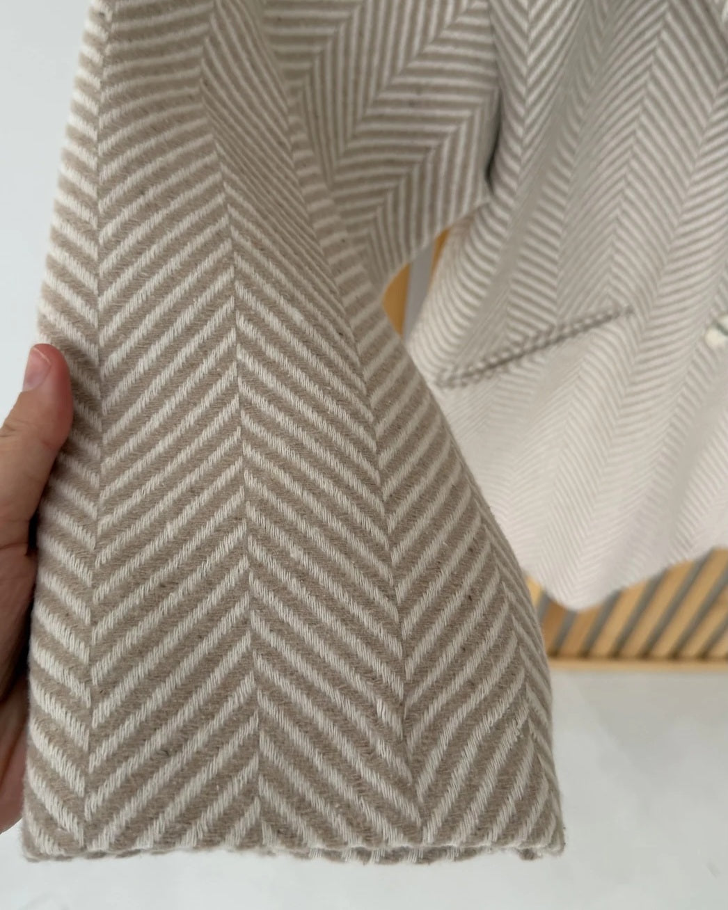 This stylish stone herringbone coat is your new go-to for chilly days, blending warmth with effortless elegance. Crafted from a luxurious wool blend, it offers cozy comfort without compromising on sophisticated style. Its classic pattern and tailored fit make it a versatile addition to any wardrobe, perfect for both casual outings and dressier occasions. Wrap yourself in this chic outerwear and embrace the season with a touch of playful charm.