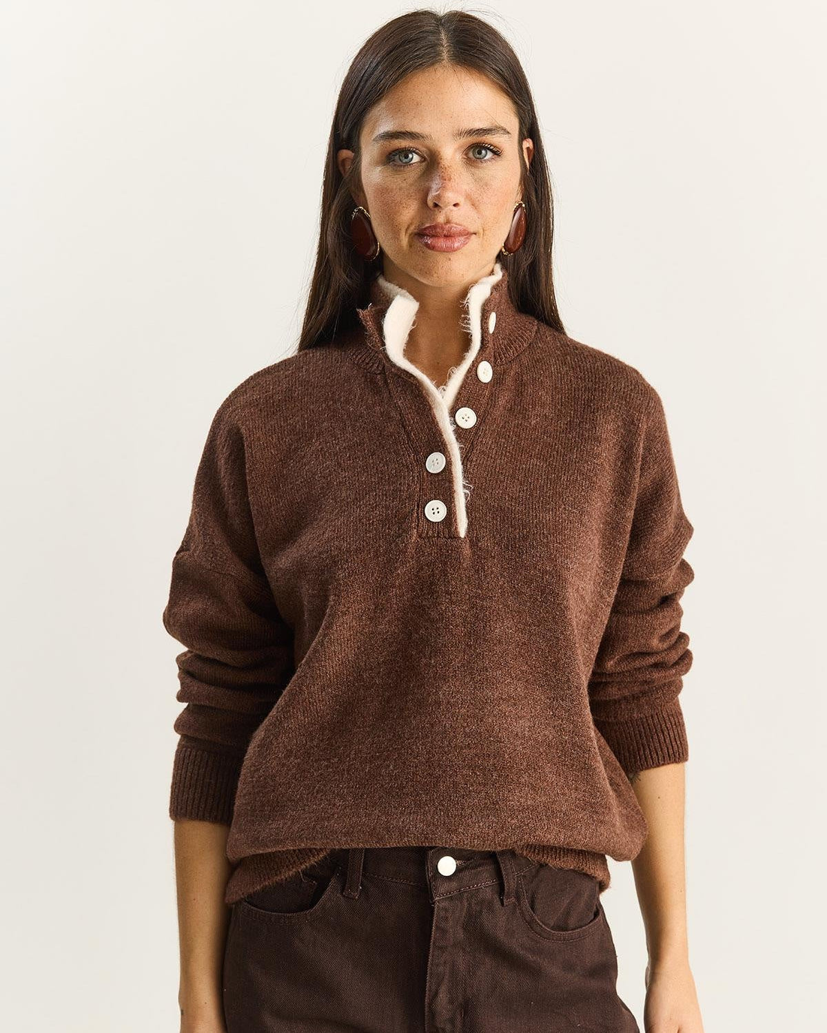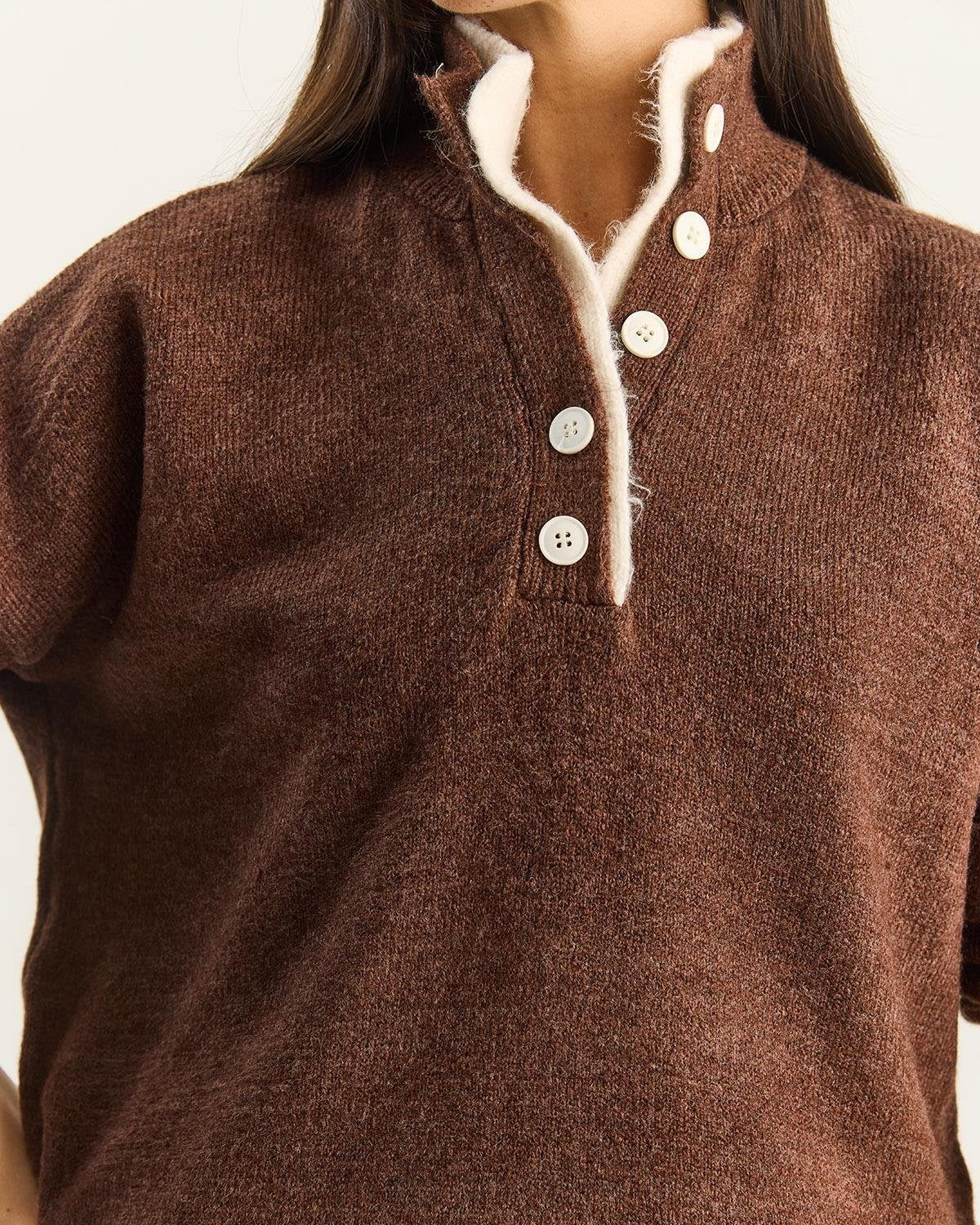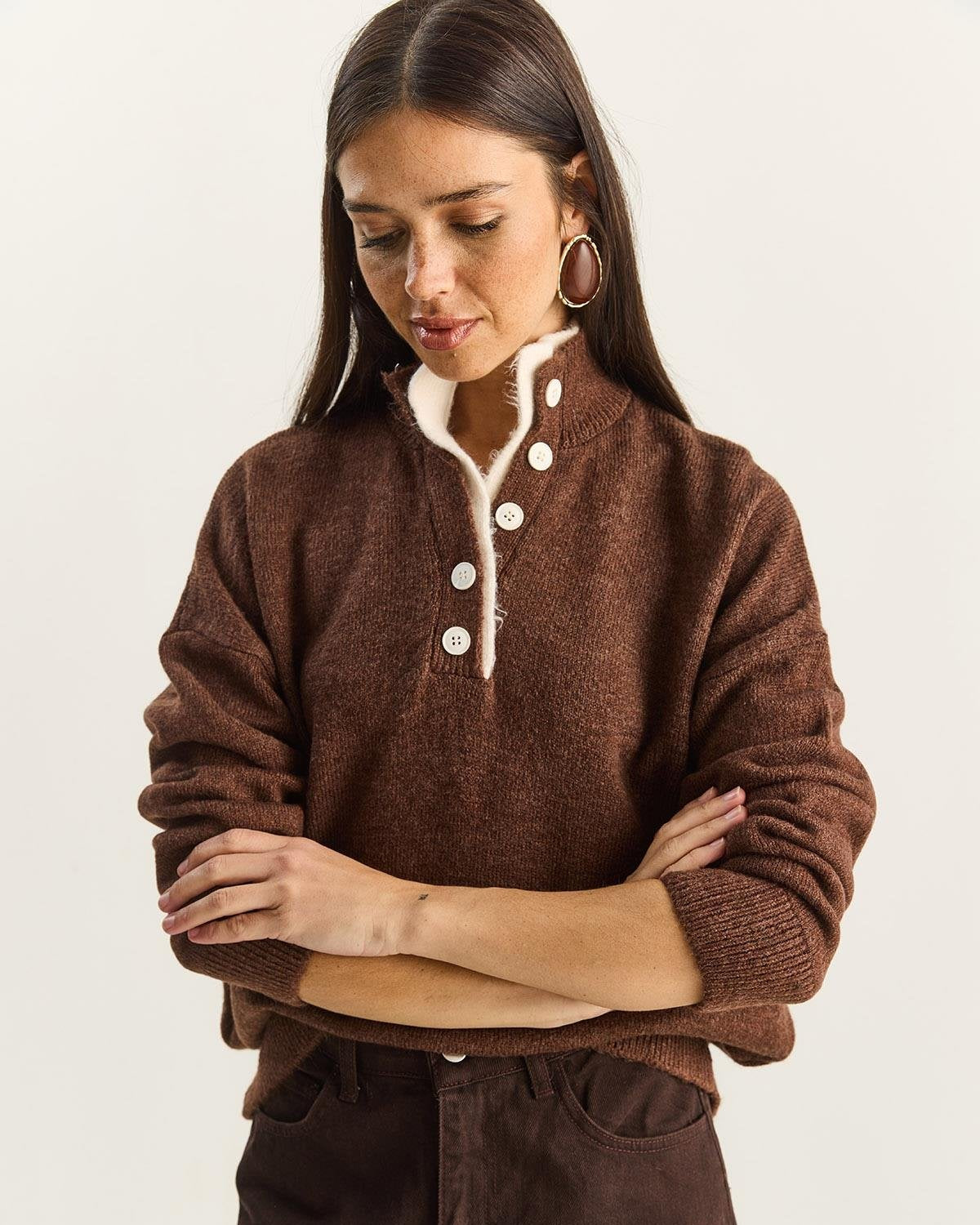 Stay cozy and chic with this soft knit sweater featuring a unique double-placket button design. The rich bitter coffee hue brings a warm, sophisticated vibe to your winter wardrobe. Crafted from a durable acrylic blend, it offers the perfect balance of comfort and lasting shape for everyday wear. This stylish piece transitions effortlessly from casual coffee dates to polished office looks.