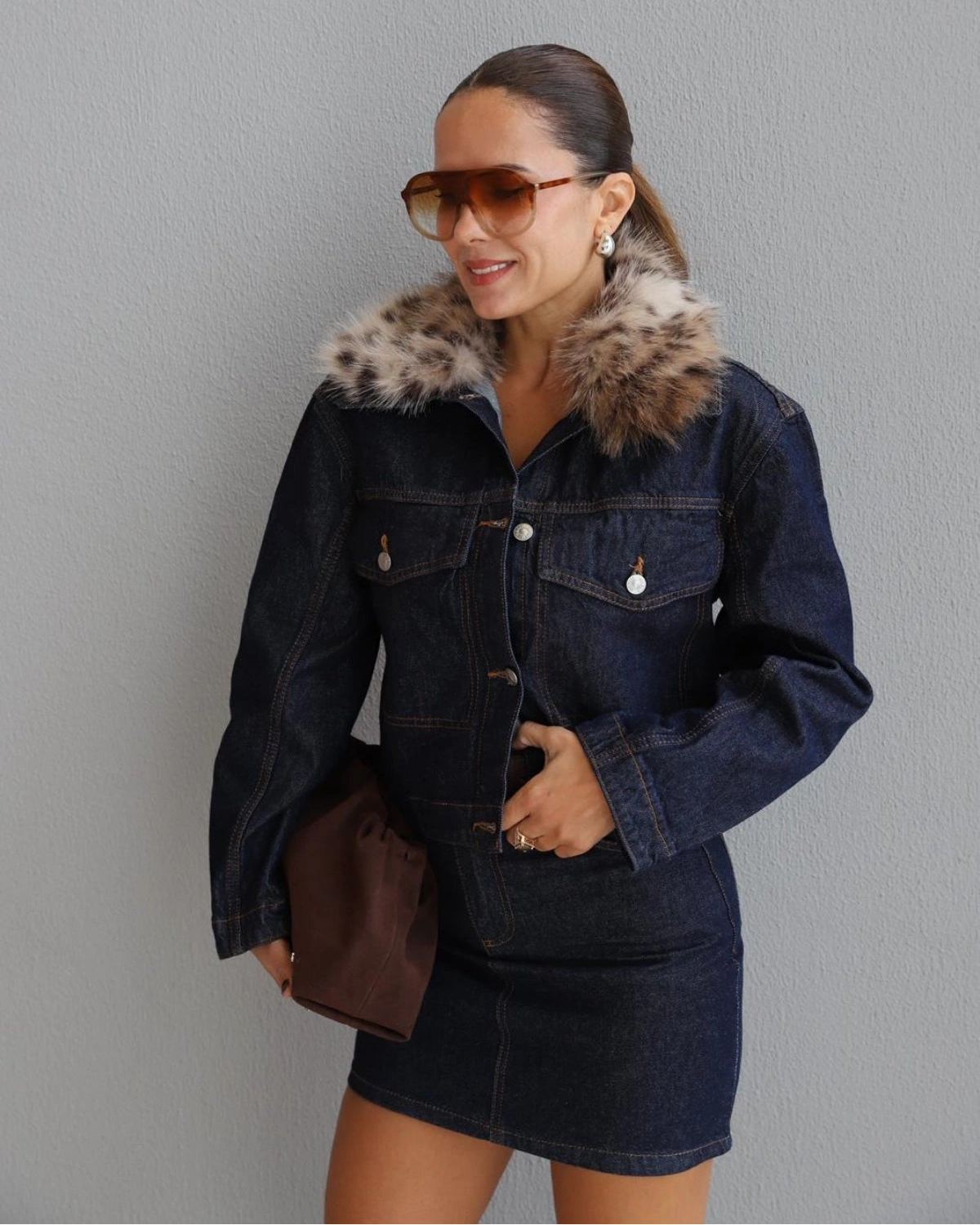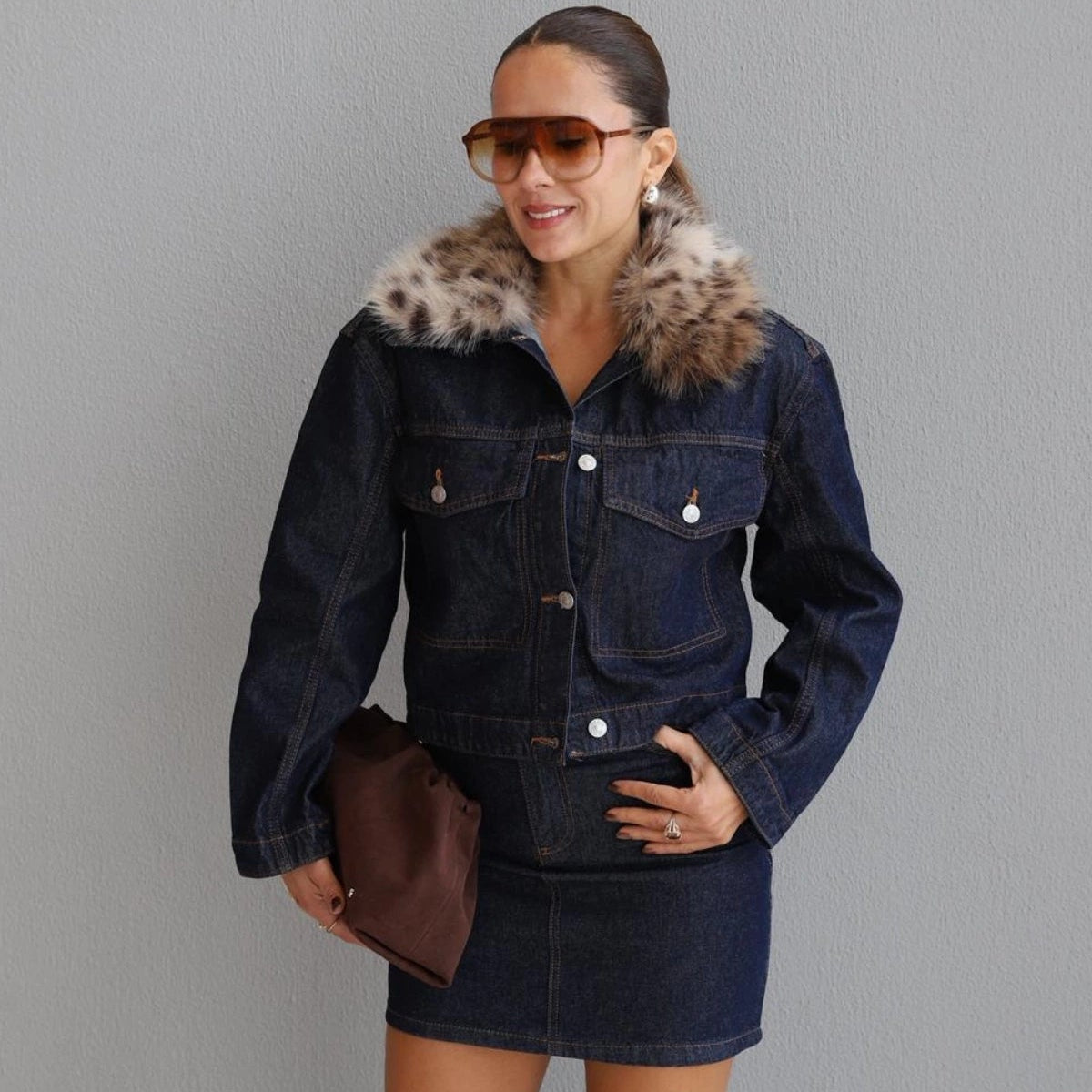 Strut your stuff in this stunning navy blue denim jacket, complete with a wild leopard print faux fur collar. It's the perfect way to add a playful yet chic touch to any outfit, from casual days to daring nights out. Crafted for comfort and designed to drop jaws, this jacket is your new go-to for making a statement. Get ready to turn heads and embrace your inner fashionista!