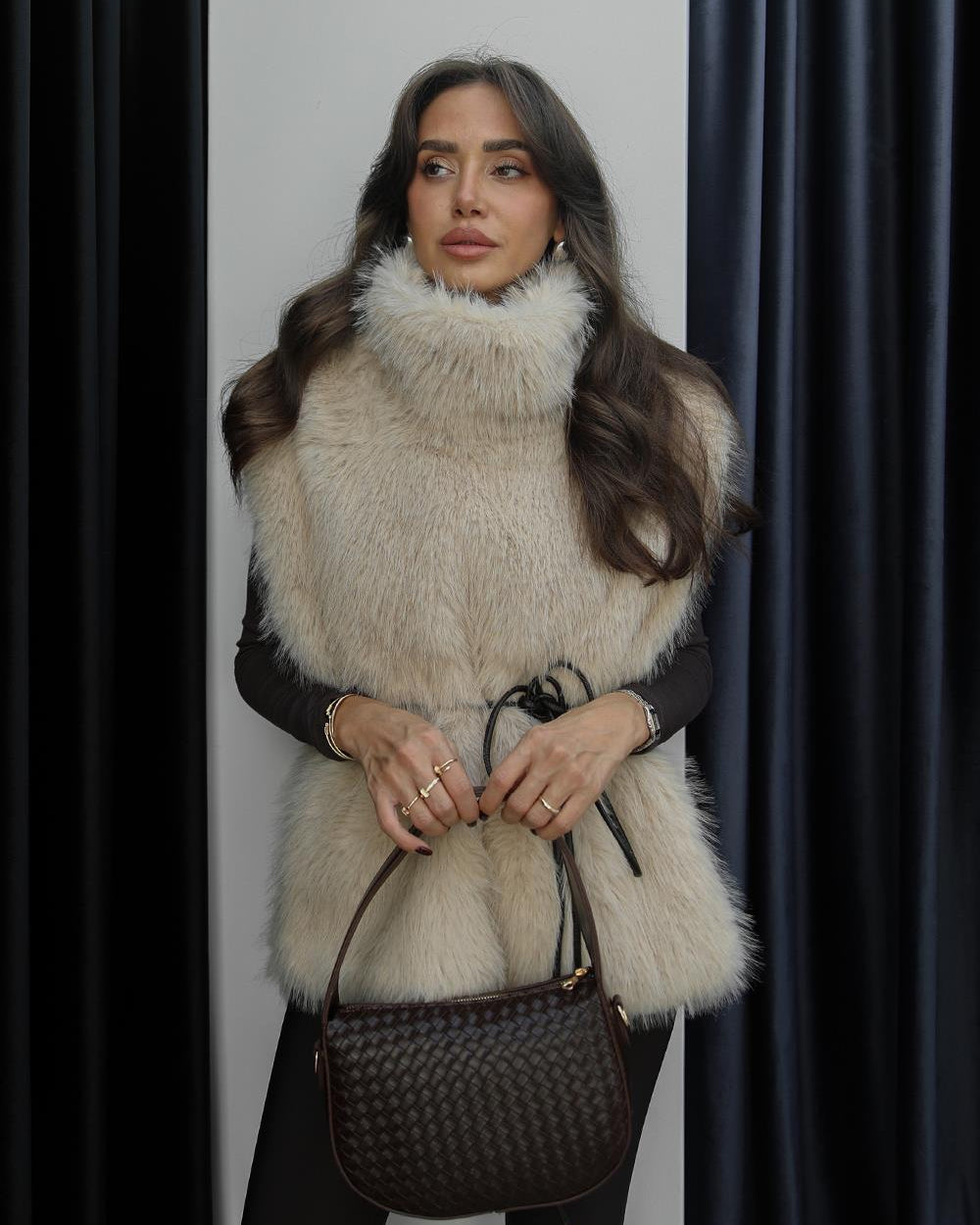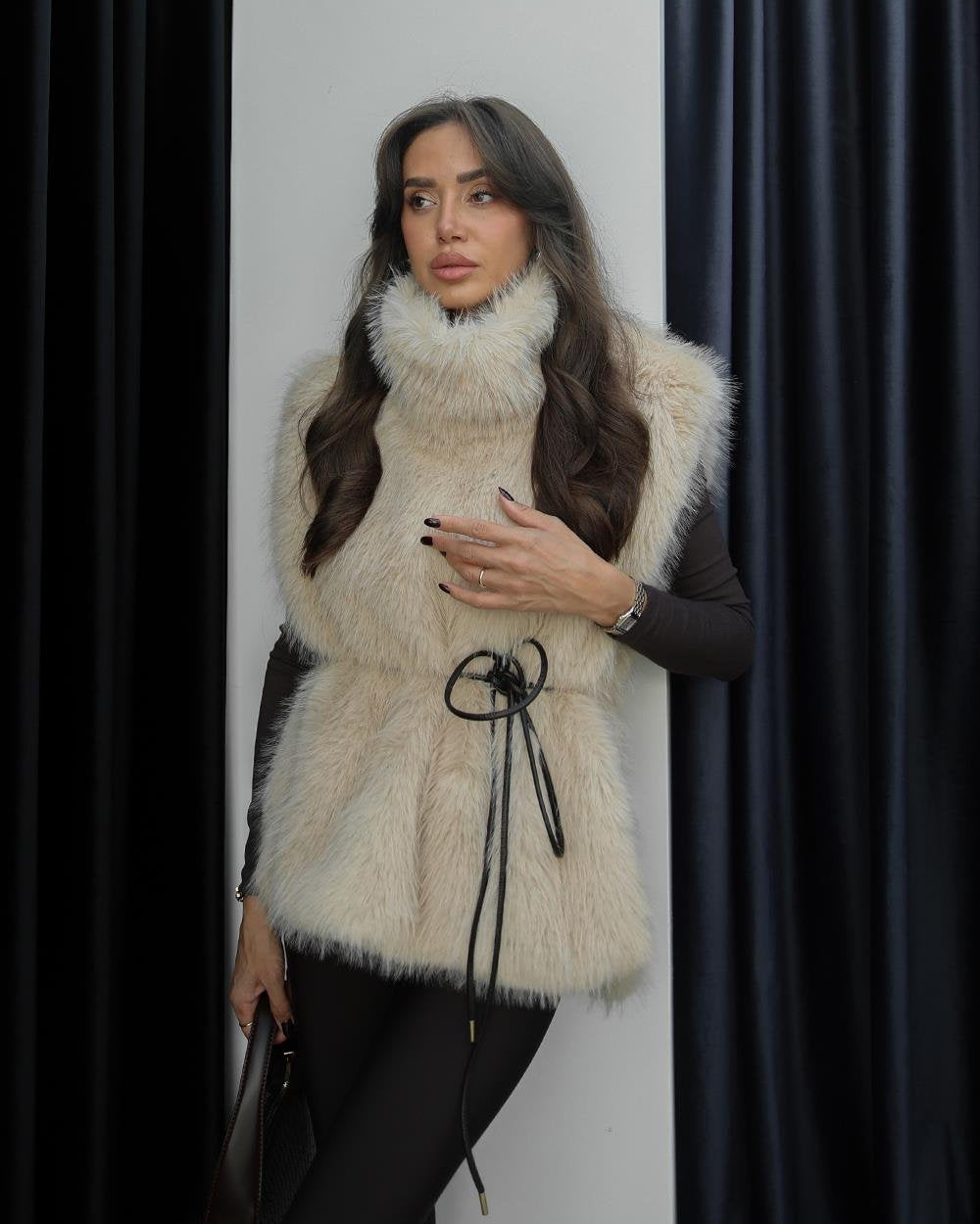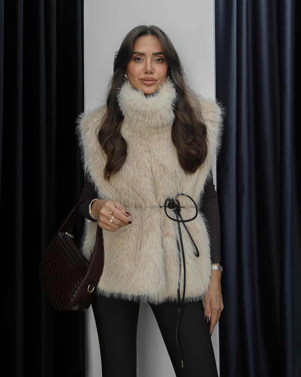 Wrap yourself in pure cozy elegance with this delightful beige faux fur sweater vest. Its chic high-neck design and sleeveless cut offer a playful yet sophisticated look, perfect for layering. Crafted with a soft knit fabric and finished with stylish leather cord details, it redefines comfortable fashion. Embrace warmth and effortless style with this must-have addition to your wardrobe.