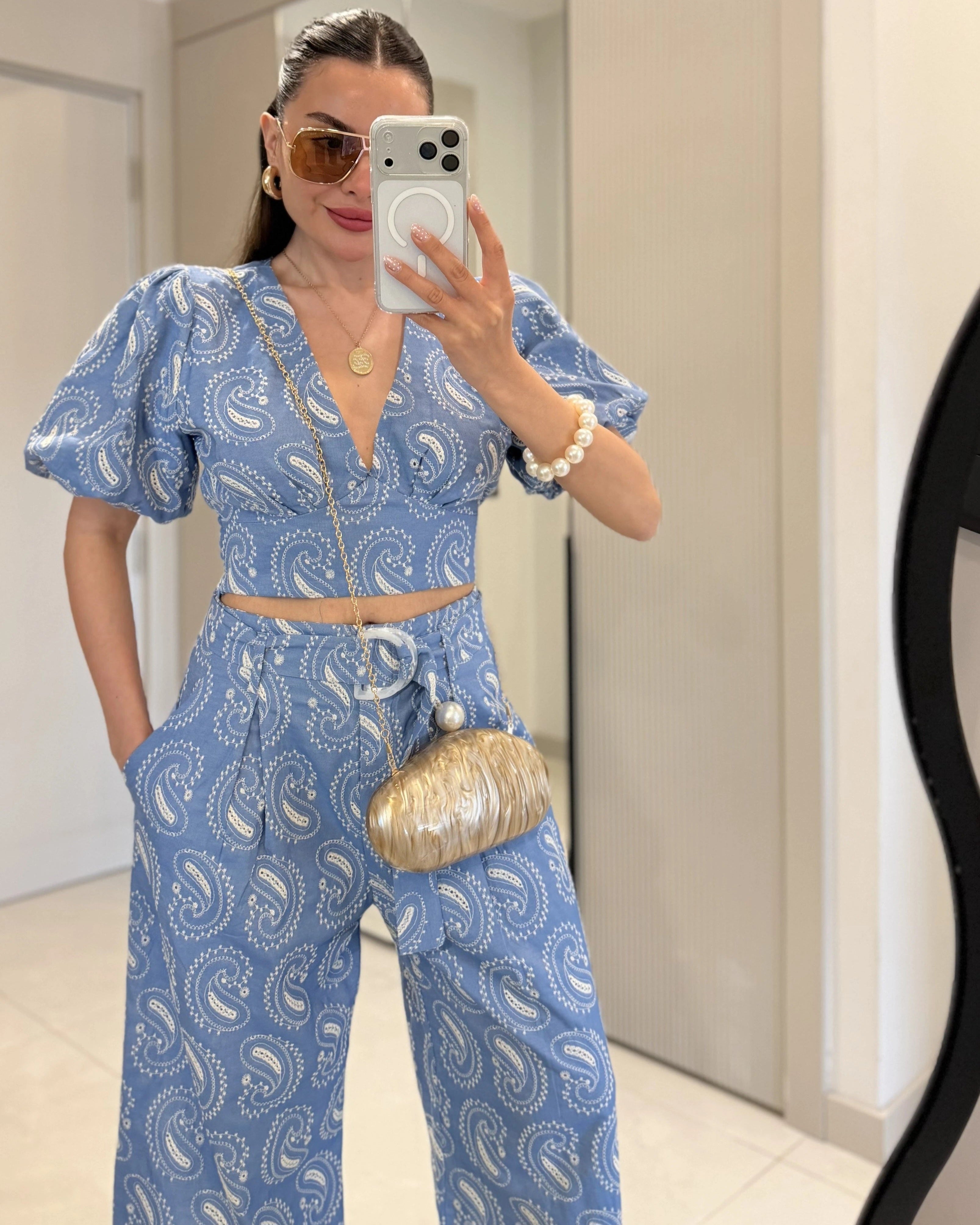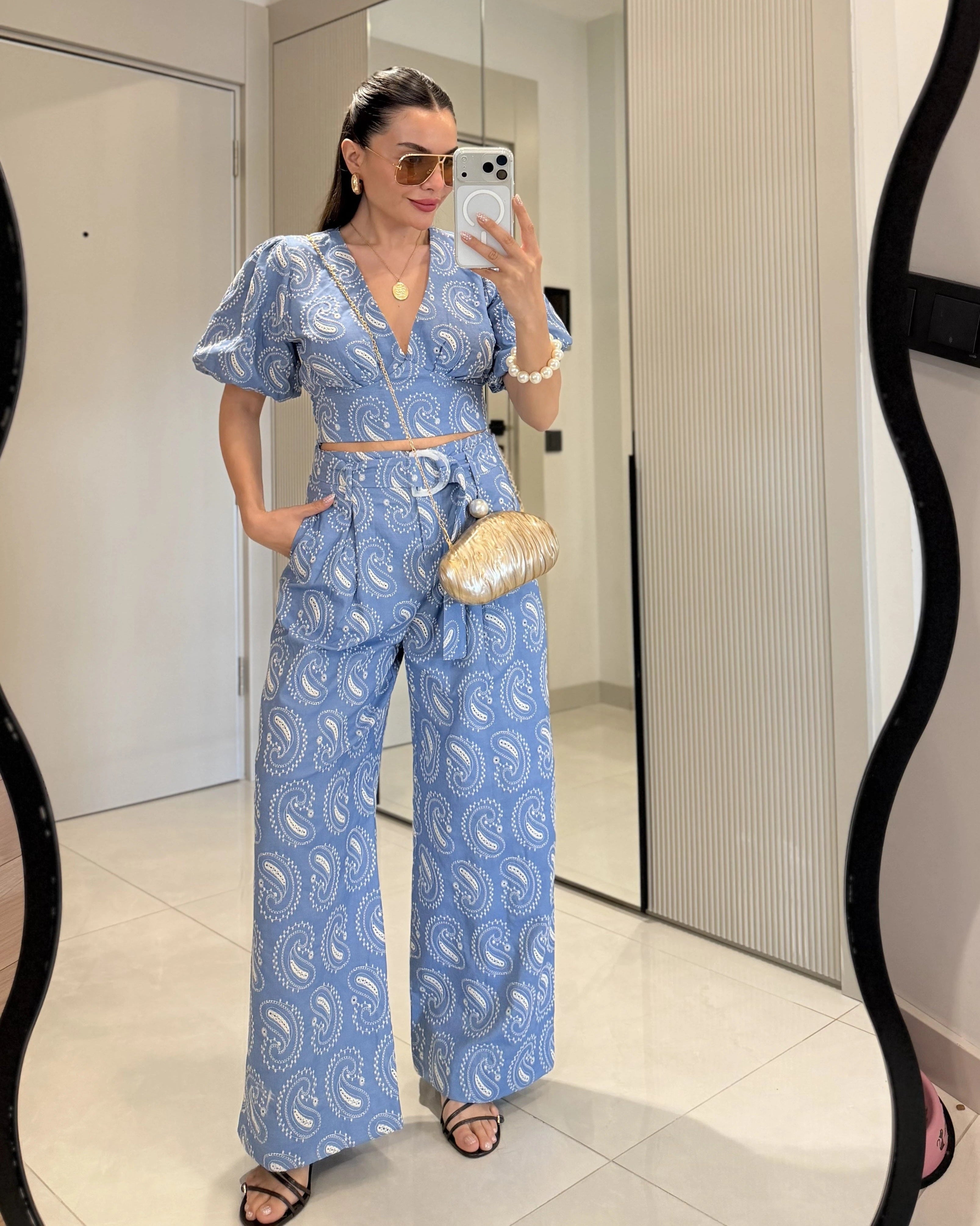 Paisley Sleeve Blouse with Pant Set – Light Blue