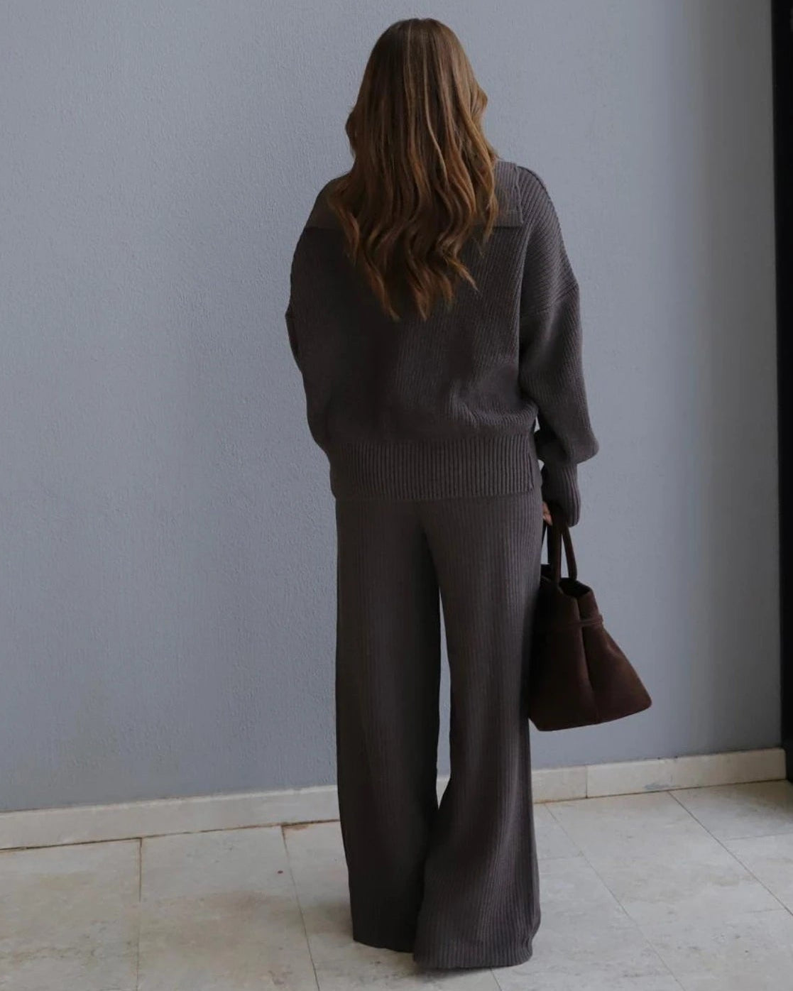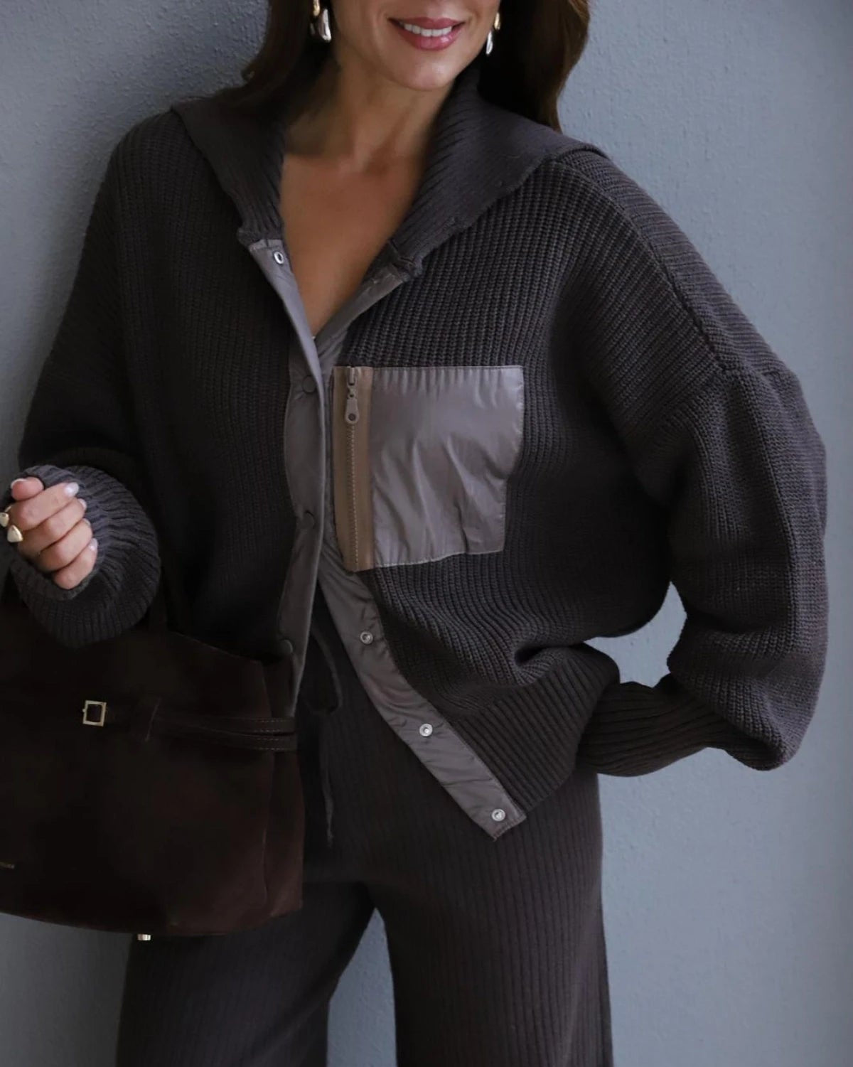 This cozy brown knitwear set brings effortless chic to your everyday wardrobe with its soft texture and relaxed fit. The button-down cardigan features a contrasting pocket detail that adds a quirky touch to your lounge-to-street look. Paired with comfortable wide-leg trousers, this duo ensures you stay stylishly warm without sacrificing any comfort. It is the perfect match for busy mornings or relaxed weekends when looking put-together is a must!