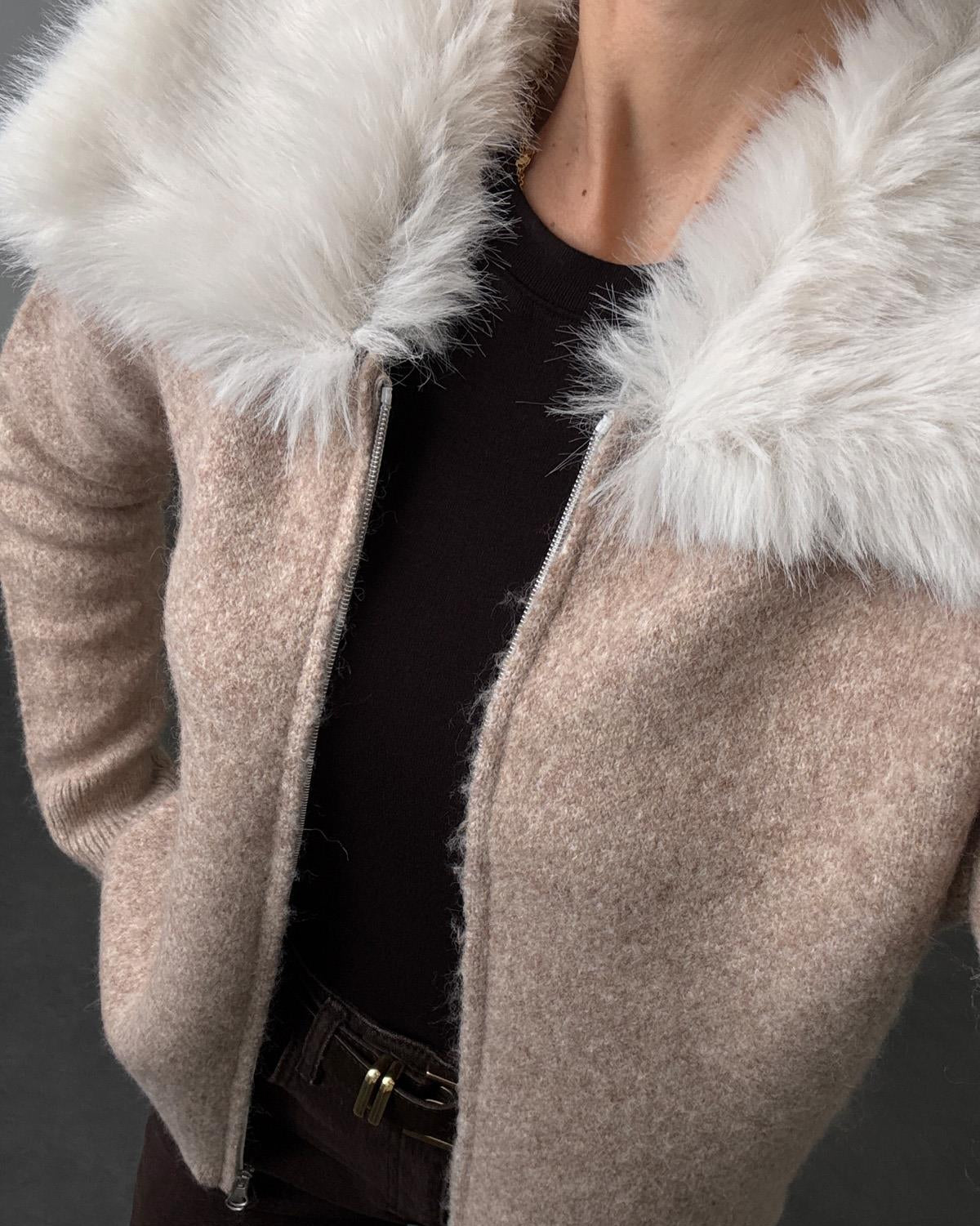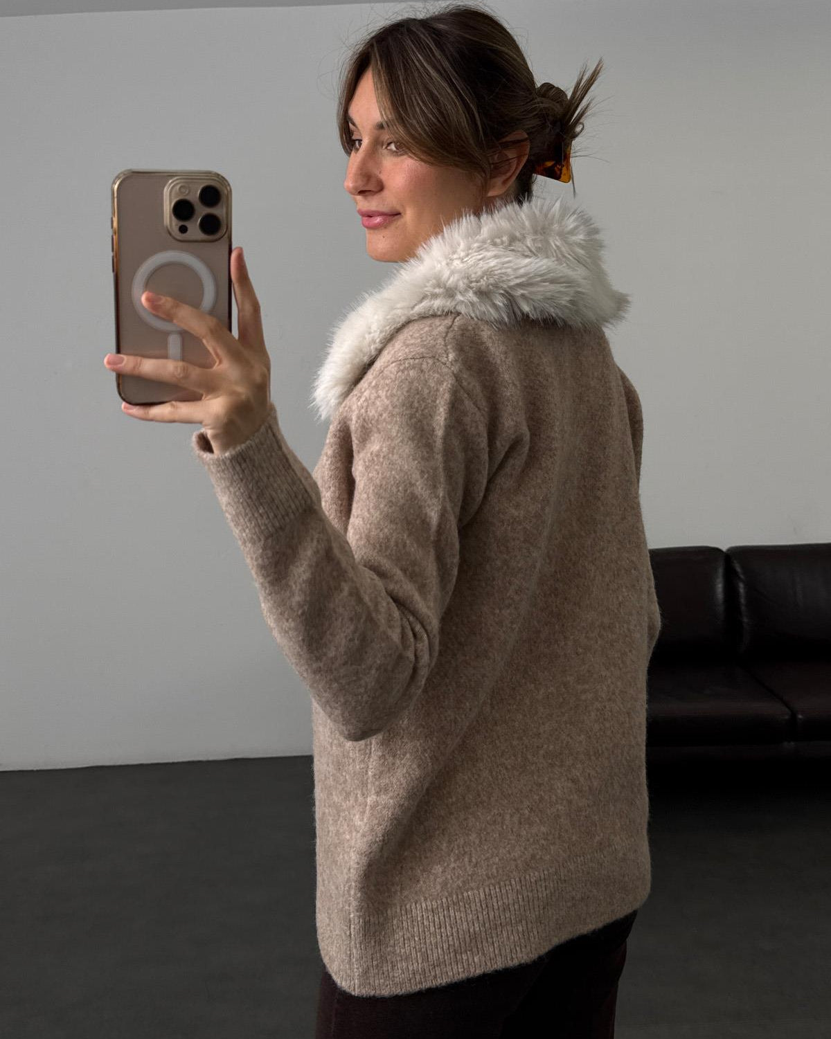 Wrap yourself in this cozy beige knit cardigan featuring a plush fur collar for that extra touch of glam. This versatile piece blends recycled materials with a hint of wool to keep you warm and eco-conscious. Whether you're heading to brunch or a chilly office, its relaxed fit ensures you stay comfortable while looking chic. Snag this stylish essential and let your outfit do the talking all season long!