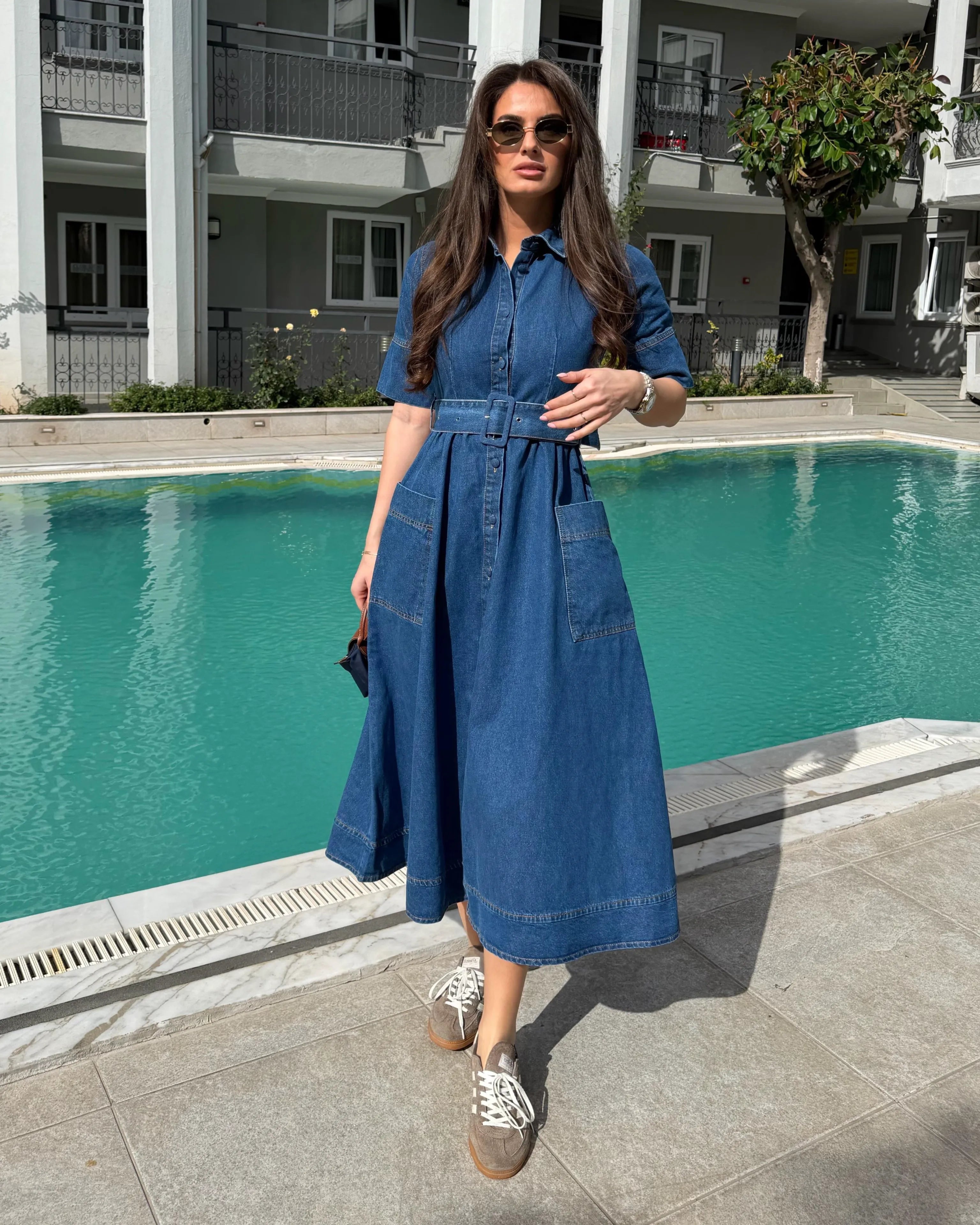 Shirt Collar Belted Pocket Detail Denim Dress