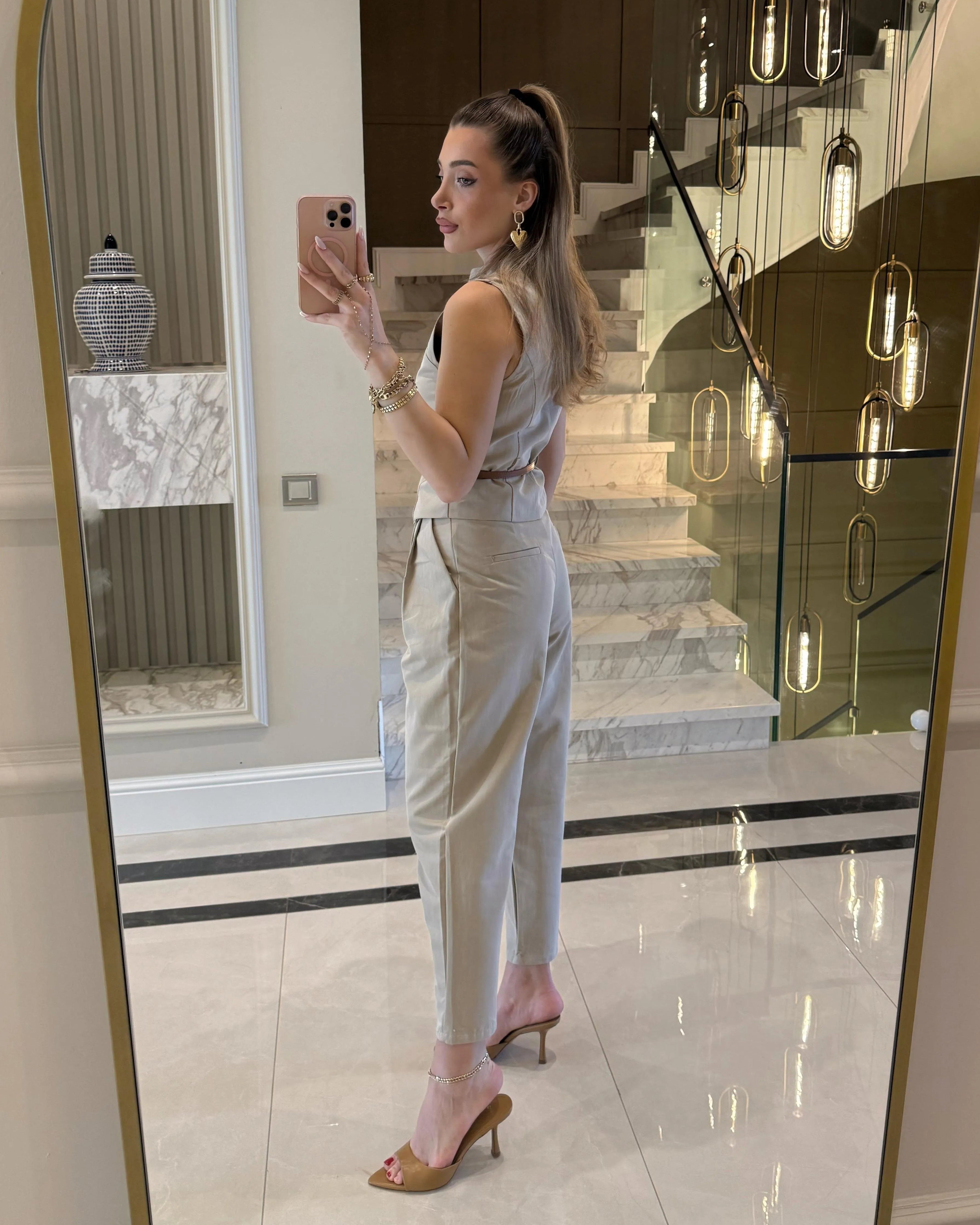 Victoria Belted Zip-Up Vest and Trousers Set - Beige