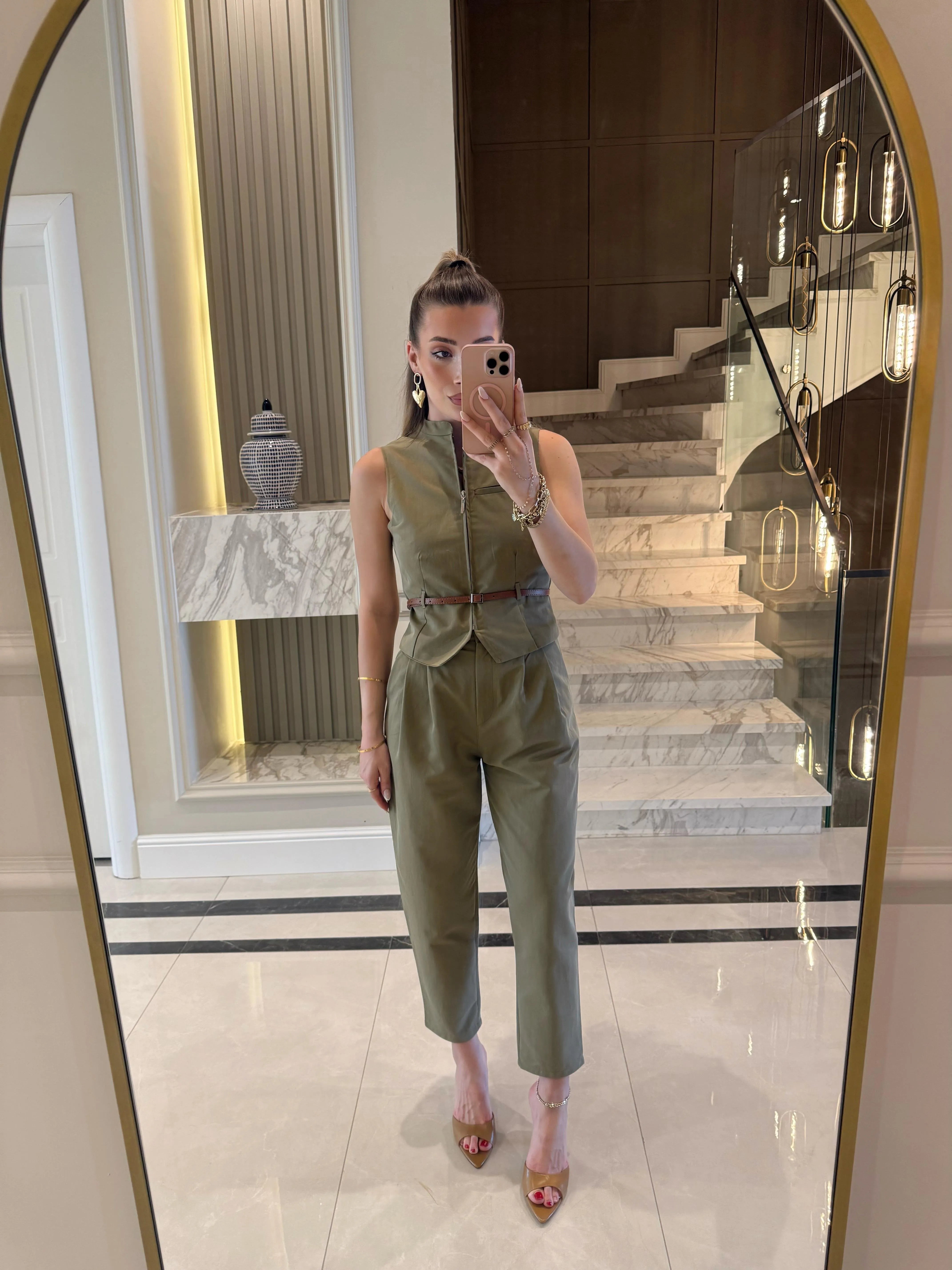 Victoria Belted Zip-Up Vest and Trousers Set - Khaki